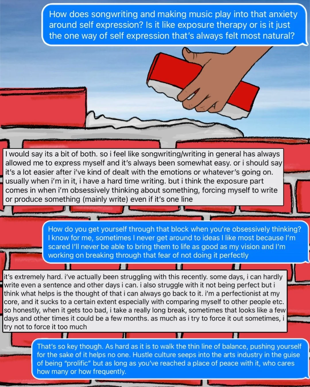 Imani: I would say its a bit of both. so i feel like songwriting/writing in general has always allowed me to express myself and it’s always been somewhat easy. or i should say it’s a lot easier after i’ve kind of dealt with the emotions or whatever’s going on. usually when i’m in it, i have a hard time writing. but i think the exposure part comes in when i’m obsessively thinking about something, forcing myself to write or produce something (mainly write) even if it’s one line.