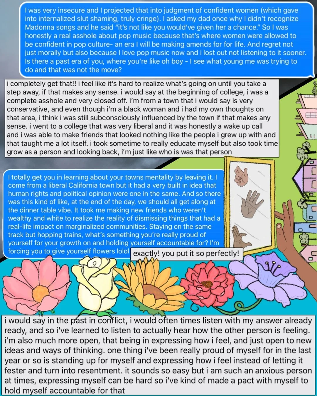 Imani: i completely get that!! i feel like it’s hard to realize what’s going on until you take a step away, if that makes any sense. i would say at the beginning of college, i was a complete asshole and very closed off. i’m from a town that i would say is very conservative, and even though i’m a black woman and i had my own thoughts on that area, i think i was still subconsciously influenced by the town if that makes any sense. i went to a college that was very liberal and it was honestly a wake up call and i was able to make friends that looked nothing like the people i grew up with and that taught me a lot itself. i took sometime to really educate myself but also took time grow as a person and looking back, i’m just like who is was that person