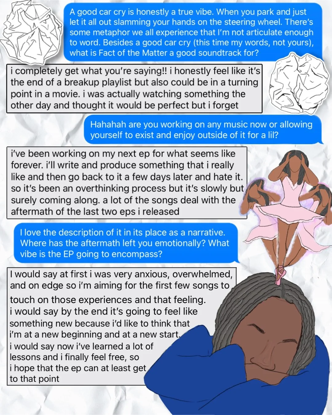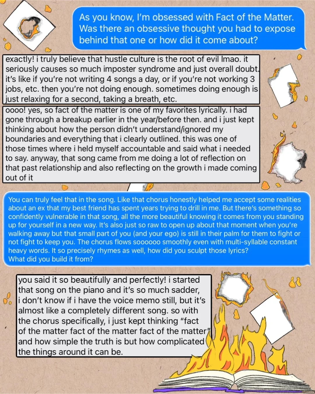 Imani: you said it so beautifully and perfectly! i started that song on the piano and it’s so much sadder, i don’t know if i have the voice memo still, but it’s almost like a completely different song. so with the chorus specifically, i just kept thinking “fact of the matter fact of the matter fact of the matter” and how simple the truth is but how complicated the things around it can be. and i kind of pictured it as if i was actually saying it to my ex for the last time, as if i was being blunt instead of caring how he felt this time. i just wanted it to also be a slap in the face in a way, like i tried so so hard even though what was going on was shattering me and you couldn’t even tell me what was going on and you didn’t even fight for it