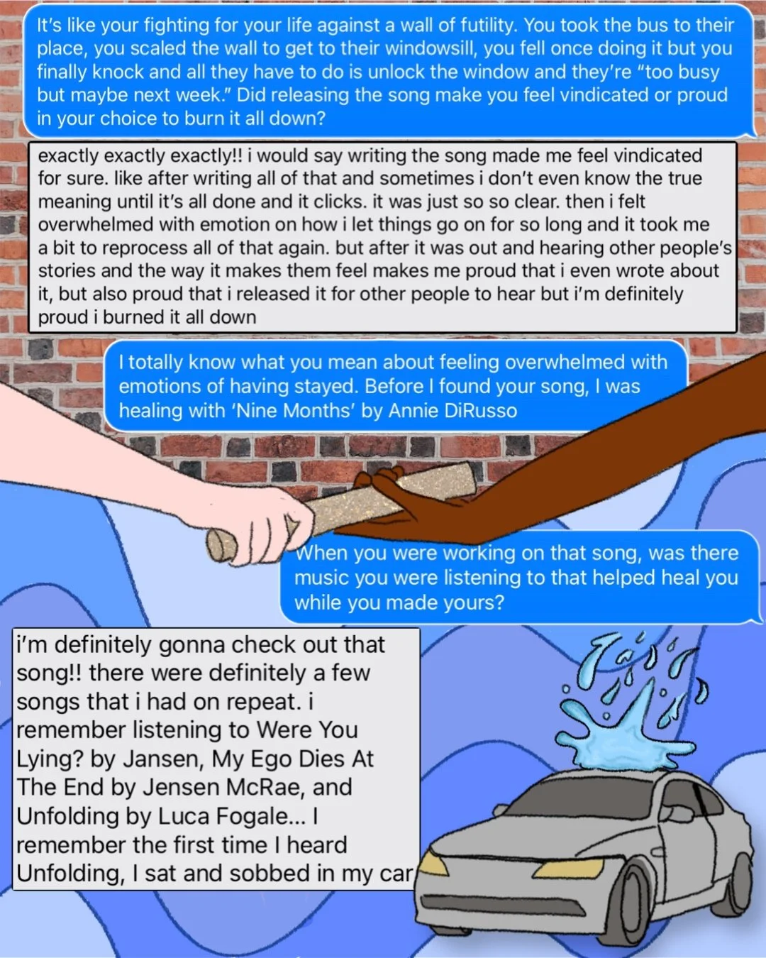 Imani: exactly exactly exactly!! i would say writing the song made me feel vindicated for sure. like after writing all of that and sometimes i don’t even know the true meaning until it’s all done and it clicks. it was just so so clear. then i felt overwhelmed with emotion on how i let things go on for so long and it took me a bit to reprocess all of that again. but after it was out and hearing other people’s stories and the way it makes them feel makes me proud that i even wrote about it, but also proud that i released it for other people to hear but i’m definitely proud i burned it all down