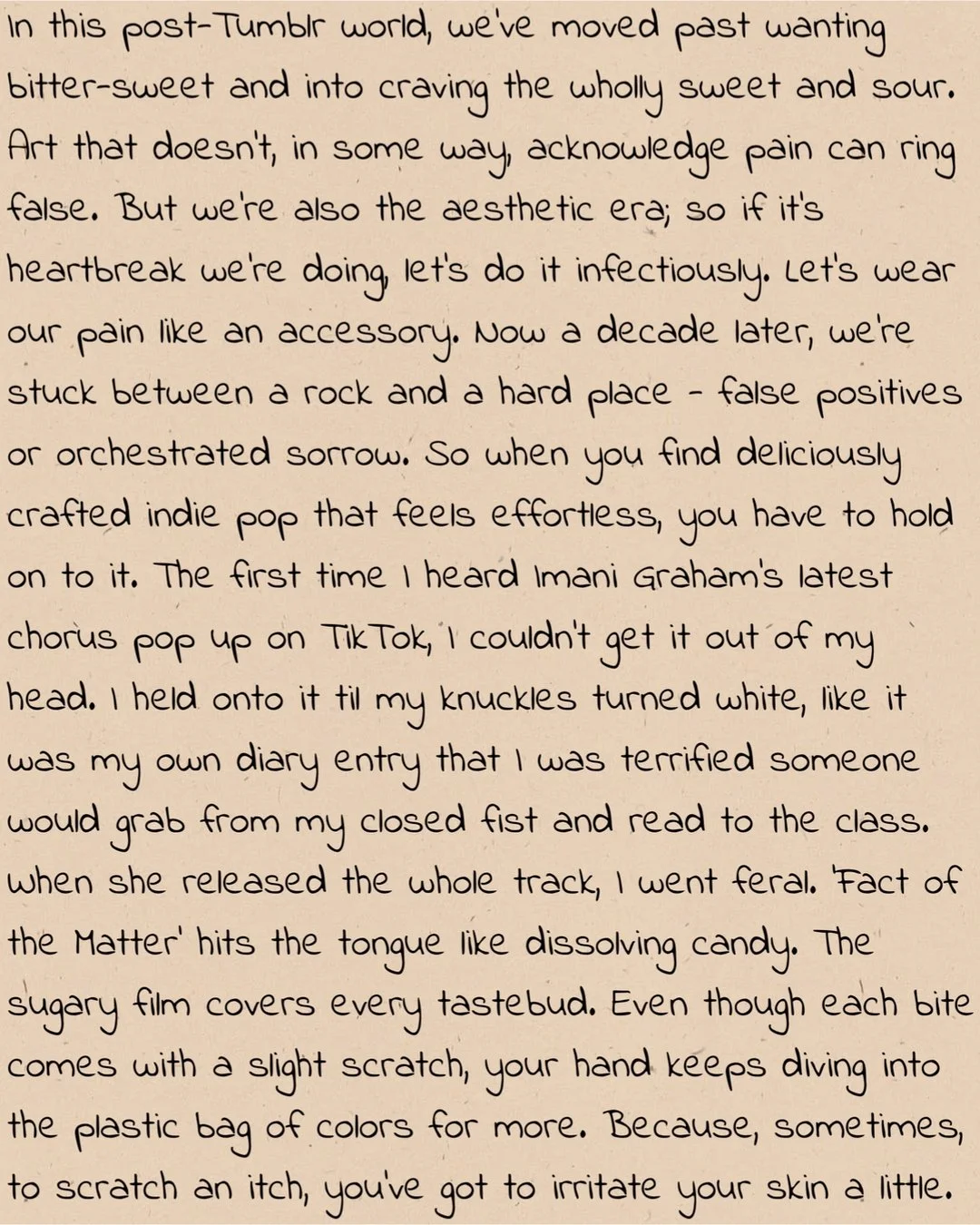 In this post-Tumblr world, we’ve moved past wanting bitter-sweet and into craving the wholly sweet and sour. Art that doesn’t, in some way, acknowledge pain can ring false. But we’re also the aesthetic era; so if it’s heartbreak we’re doing, let’s do it infectiously. Let’s wear our pain like an accessory. Now a decade later, we’re stuck between a rock and a hard place - false positives or orchestrated sorrow. So when you find deliciously crafted indie pop that feels effortless, you have to hold on to it. The first time I heard Imani Graham’s latest chorus pop up on TikTok, I couldn’t get it out of my head. I held onto it til my knuckles turned white, like it was my own diary entry that I was terrified someone would grab from my closed fist and read to the class. When she released the whole track, I went feral. ‘Fact of the Matter’ hits the tongue like dissolving candy. The sugary film covers every tastebud. Even though each bite comes with a slight scratch, your hand keeps diving into the plastic bag of colors for more. Because, sometimes, to scratch an itch, you’ve got to irritate your skin a little.