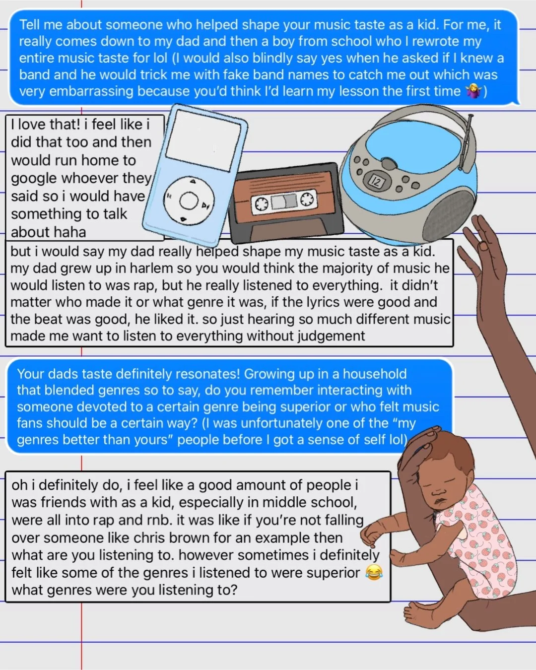 Imani: oh i definitely do, i feel like a good amount of people i was friends with as a kid, especially in middle school, were all into rap and rnb. it was like if you’re not falling over someone like chris brown for an example then what are you listening to. however sometimes i definitely felt like some of the genres i listened to were superior 😂 what genres were you listening to