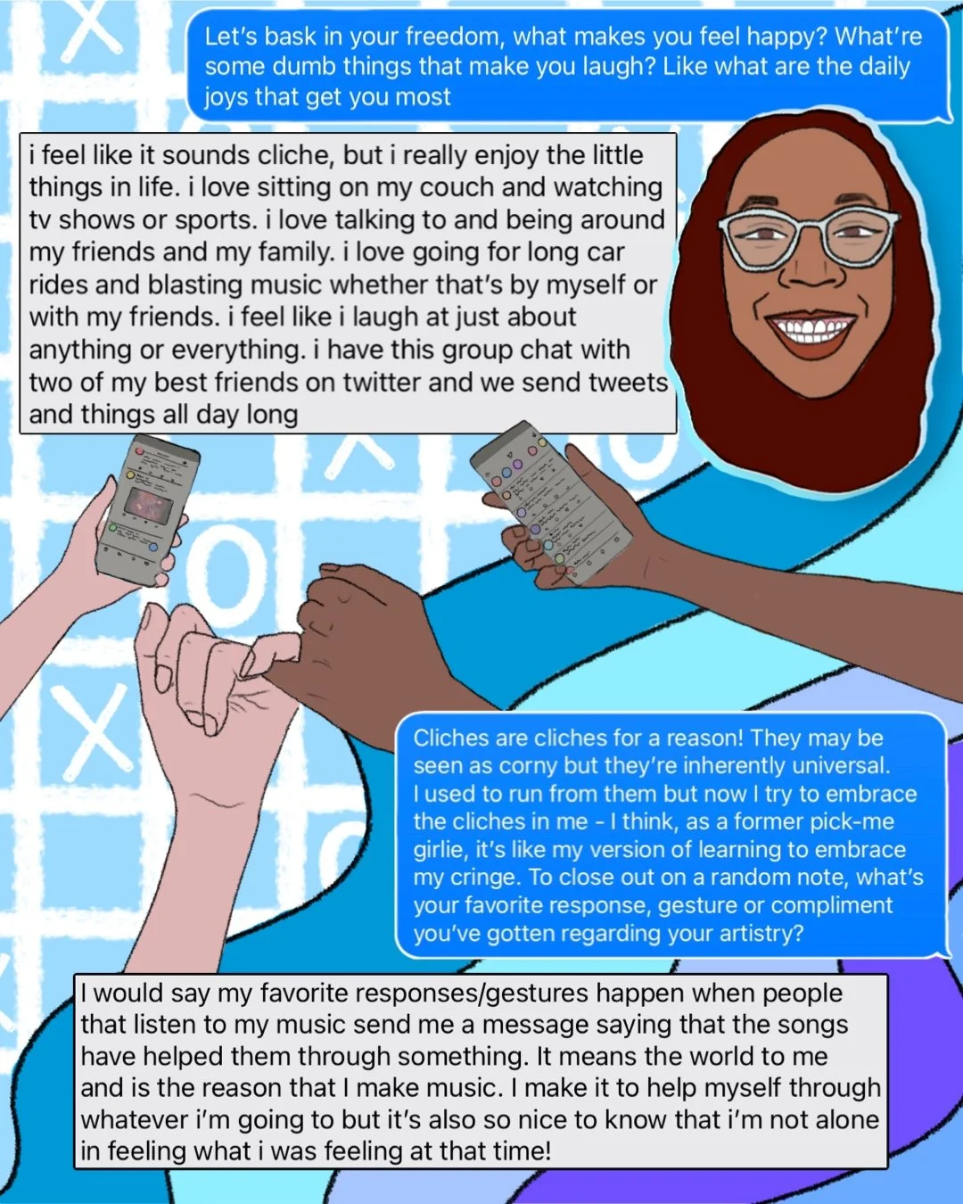 Imani: i feel like it sounds cliche, but i really enjoy the little things in life. i love sitting on my couch and watching tv shows or sports. i love talking to and being around my friends and my family. i love going for long car rides and blasting music whether that’s by myself or with my friends. i feel like i laugh at just about anything or everything. i have this group chat with two of my best friends on twitter and we send tweets and things all day long